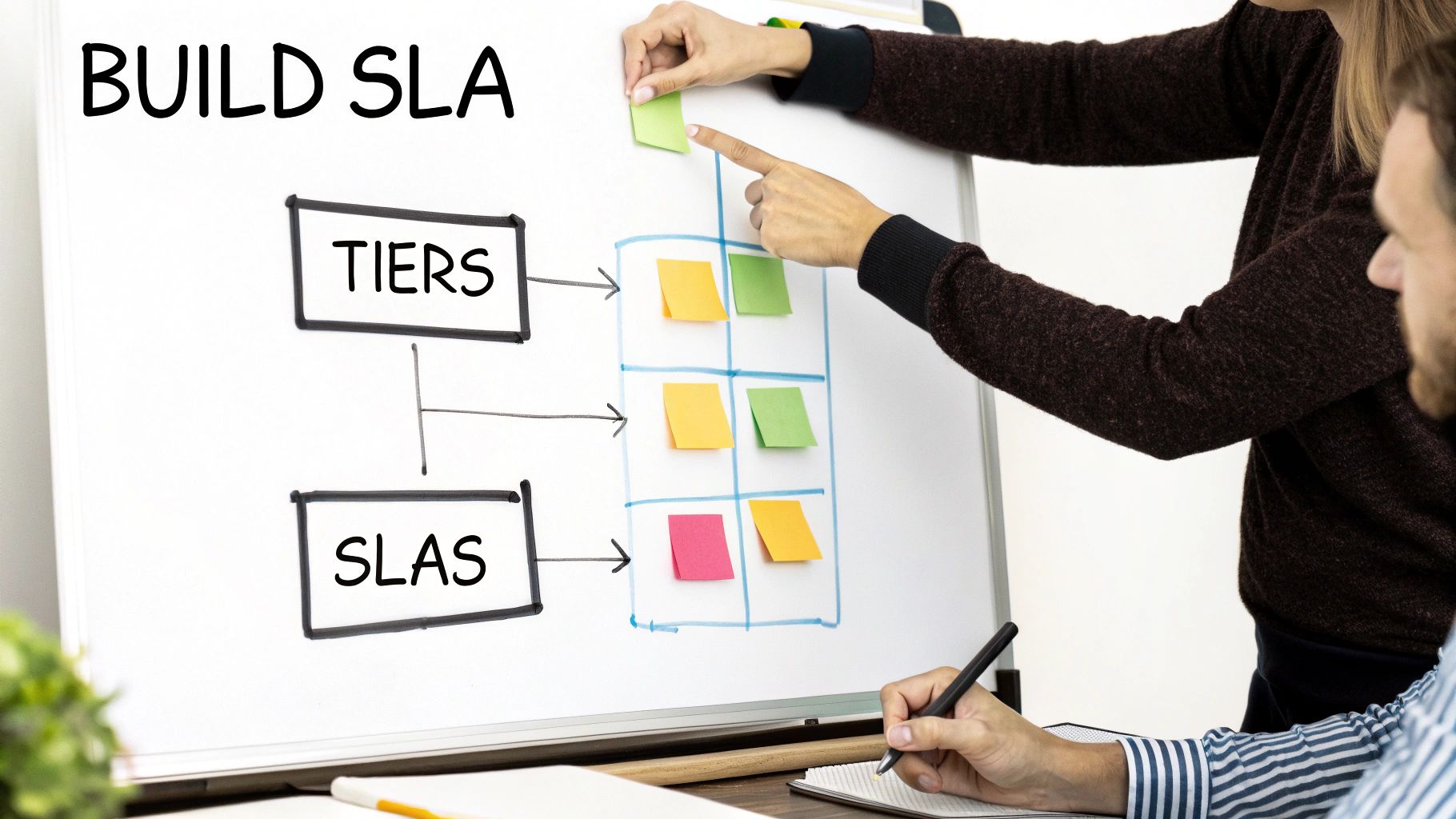 - Pro/Business Tier: Now we're making real commitments. This is where you'd introduce a 99.9% uptime guarantee and define response times—maybe within 8 business hours for support tickets.